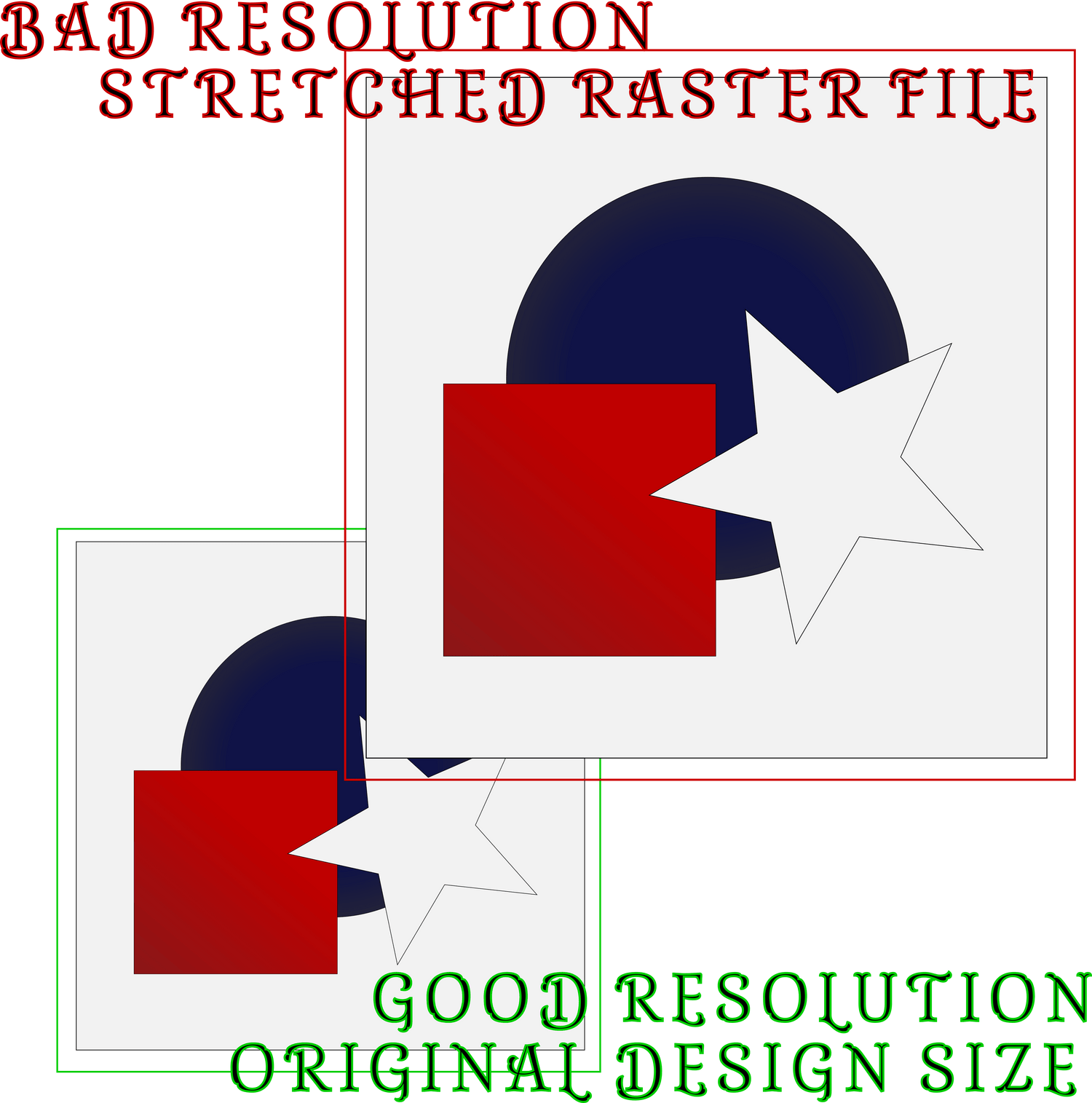 Notes: When starting to create your designs in your chosen software. Make sure your raster file size is proper before creating it in software. On the other hand vector files can be stretched without image, quality loss, and without introduction of semi-transparent pixels. WE STRONGLY ADVISE USING ONLY VECTOR FILES TO AVOID INTRODUCTION OF SEMI-TRANSPARENT PIXELS THAT CAN HAPPEN WHEN RESIZING RASTER FILES.