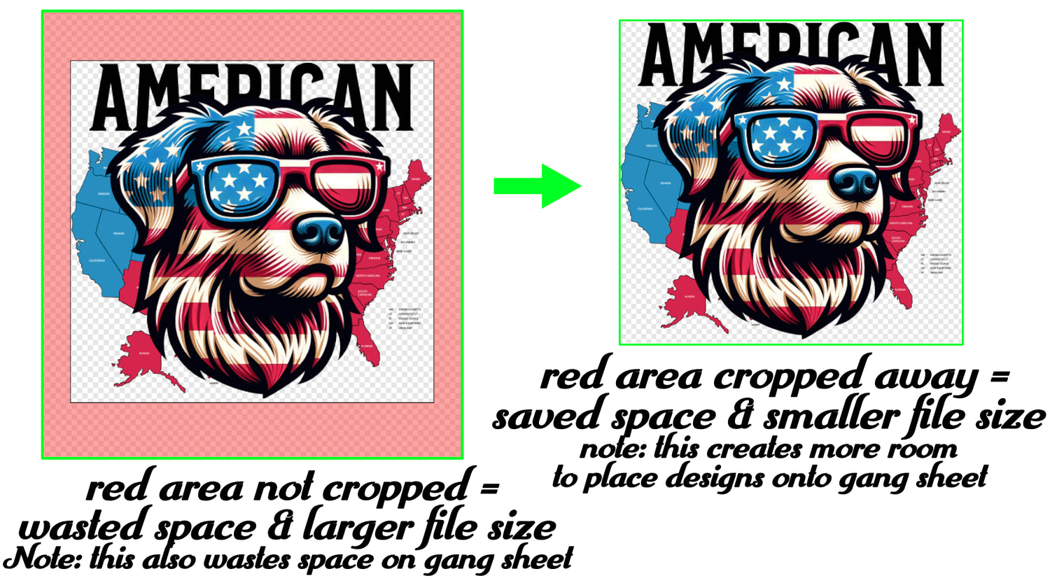 ✔ Crop your images to their edges to save space on gang sheets and file size.