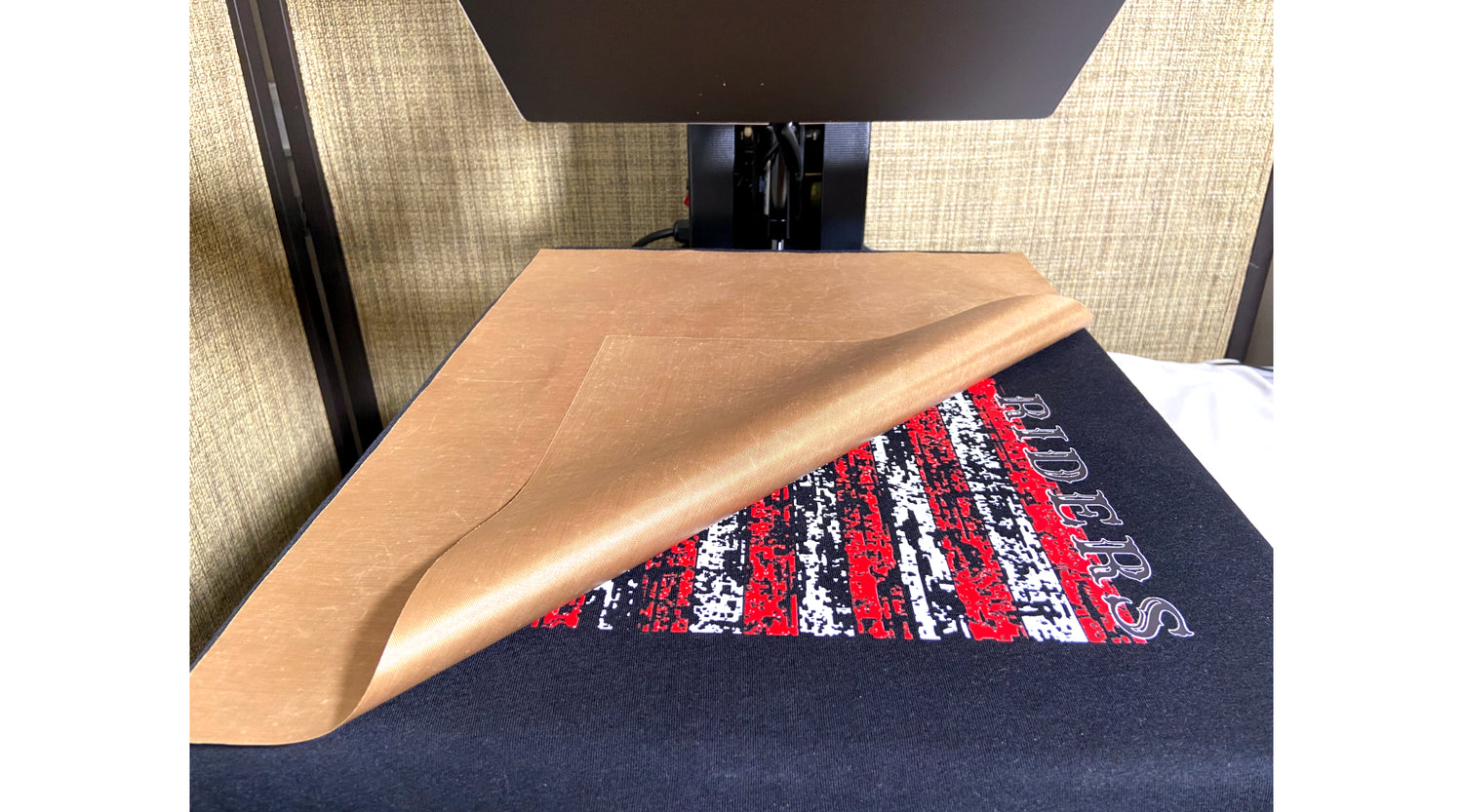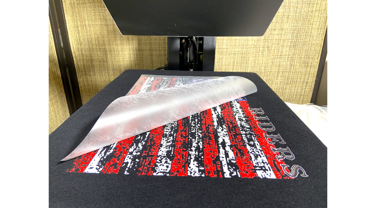 Cold peel film: pressed with medium to heavy pressure. 30-60 psi if using pneumatic. Tip: Different pressures will result in different finishes. Not enough pressure with result in a transfer to not adhere properly. While just above not enough pressure will result in a smooth finish. Heavier pressure will result in a transfer that's pressed deeper into the substrate leaving a textured finish. Ideally set the pressure to let the t-shirt texture show through the transfer and then back the pressure off a bit until texture barley shows this is the sweet spot.